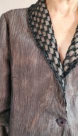 Tailleur in organza stropicciata nera, sovrapposta a uno stato bronzo.Gonna dritta con stacco sul lato sinistro, giacca semivita con collo sciallato rivestito da tulle ricamato con corallini luminosi