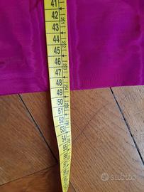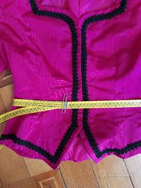 Tailleur elegante sartoriale da donna in moiré di seta fucsia con bordi in passamaneria neri, vintage . Misura corrispondente ad una 44/46. Misura girovita della gonna cm. 76, misura vita della giacchetta cm. 79 Lunghezza gonna cm. 48, larghezza spalle cm. 40,5 come da foto allegate. Le foto fanno parte integrante della descrizione
