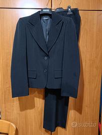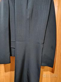 tailleur donna elegante nero con pantaloni,presenta una riga argento,usato una sola volta per cui è come nuovo,,taglia 42 per donna alta max,1,55,il pantalone è un po' svasato alla caviglia