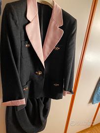 Revers e polsini in raso rosa, bottoni gioiello e gonna portafoglio con interno in raso