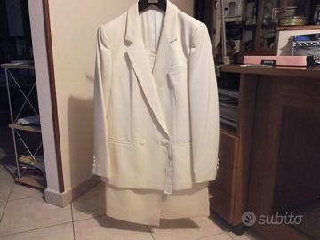 Tailleur in lana tinta panna, tg. 42/44, adatto a cerimonia. Giacca a doppio petto, gonna a portafoglio chiusa con bottoni. Torino: zona corso Belgio.