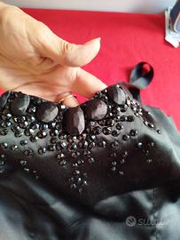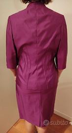 Completo di seta di tre pezzi: gonna, top e giacca. della collezione FD Passion cerimonia. Taglia 44. il top ha una lavorazione di pietre nere. La giacca ha manica a tre quarti e chiude con un bottone gioiello, scollatura con colletto coreano. La gonna arriva al ginocchio.