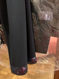 Pantaloni larghi con elastico in vita , e profilatura paillettes al fondo tono su tono .