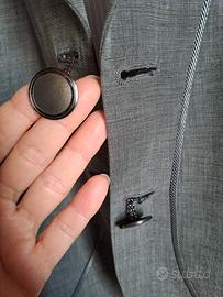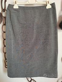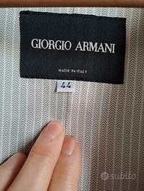 Tailleur Giorgio Armani in Lino e Cotone grigio perla con profili sottolineati ,bottoni in metallo,taschini laterali . Gonna con piccolo spacco dietro .