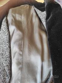 Vendo completo in lana bouclé tipo spigato bianco e nero, di lavorazione sartoriale.,confezionato per una adolescente .La giacca presenta collo e bottoni in velluto nero a contrasto e due finte tasche con pattina .
