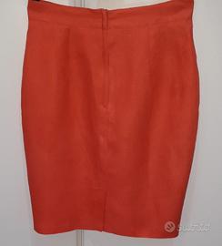 -Il primo di lino arancione, avvitato, completamente foderato, taglia 42, di Anticoli F. confezioni. Abbottonatura centrale ,impreziosita da 5 bottoni, presenti anche sulle pattine delle tasche e sulle mezze maniche. Gonna lunga 55 cm ,con cerniera e spacco posteriore.