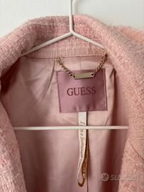 Elegante tailleur Guess in tweed rosa, composto da giacca e abito corto coordinato. Stile ispirato ai modelli Chanel, con bottoni dorati logati “G” e tessuto tweed strutturato. L’abito ha chiusura a bottoni frontali e zip posteriore; la giacca è foderata in raso con spalle leggermente imbottite.