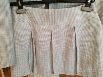 tailleur Kokai, giacca e minigonna a pieghe, a scacchetti bianca e celeste