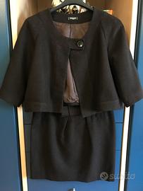 Bellissimo tailleur in stoffa, marrone , misto lana con fili in lurex composto da una minigonna modello leggermente a uovo con fiocco decorativo frontale in vita e chiusura sul retro con zip a scomparsa, foderata; una giacca corta, modello svasato, scollo tondo, manica 7/8, chiusura sullo scollo con unico bottone, foderata. Taglia 40 eur/ 44 ita, misure in foto. Composizione 45% acrilico, 25% lana, 25% poliestere, 5% altre fibre. Fodera 100% acetato. Bottoni di riserva in dotazione. Indossato in due occasioni , pari al nuovo.