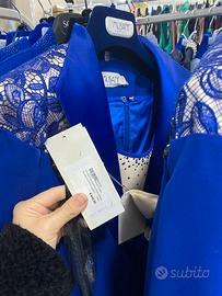 - giacca in blu cobalto impreziosita da pizzo macramé e chiusura gioiello con fiocco,