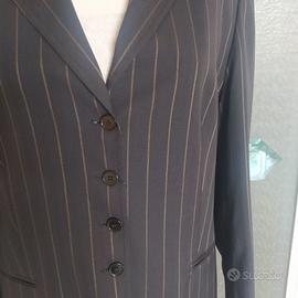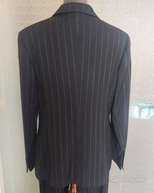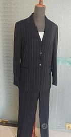 Tailleur pantalone gessato, taglio classico, colore grigio scuro con righina colore oro, pantalone senza tasche, apertura con lampo invisibile su un fianco, tessuto misto lana, giacca leggermente avvitata con 4 bottoni, TG. 46
