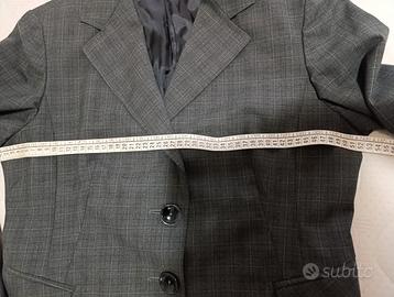 Tailleur pantalone grigio gessato bellissimo, brand Cesare Menasci, adatto a persone con busto e seno più grande rispetto alla vita e ai fianchi. La giacca infatti è più grande rispetto al pantalone. Sull'etichetta sono riportate le taglie rispettivamente 50 per la giacca e 46 per il pantalone, ma veste piccolo, pertanto, come da foto, specifico le misure. La giacca, da ascella ad ascella misura 52 cm, mentre il pantalone, alla vita misura 41 cm