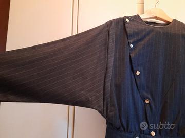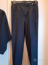 Tailleur blusa con maniche a pipistrello e pantalone blu gessato. Misure pantalone: giro vita 72 cm, giro fianchi 94 cm, lunghezza gamba interno 76 cm, lunghezza totale 107 cm (possibilità di allungare)