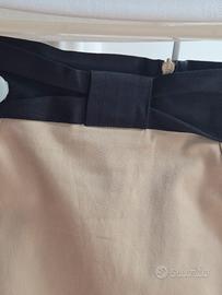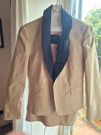 Splendido completo originale RED Valentino in fresco cotone, perfetto per la primavera/estate o per una cerimonia elegante. Il contrasto tra il color sabbia e il blu notte del revers lo rende un capo sofisticato e senza tempo.Giacca: Modello smoking monopetto con raffinato revers sciallato (shawl collar) in contrasto blu scuro. Chiusura a un bottone, tasche laterali a filetto e taschino sul petto. Struttura sartoriale impeccabile. Gonna: Coordinata in cotone beigeMateriale: 100% Cotone (fresco e leggero sulla pelle).#RedValentino #ValentinoGaravani #TailleurDonna #CompletoDonna #GiaccaSmoking #SmokingFemminile #GonnaGiacca #ValentinoStyle #RedValentinoVintage Tag di Stile e Occasione #OldMoney #QuietLuxury #CerimoniaDonna #LookInvitata #ChicStyle #BusinessCasual #PowerSuit #Sartoriale #StileParigino Tag per i Colori e Materiali #BeigeBlue #ContrastLapel #CotoneNaturale #SpringSummerLook #BeigeNavy #ColorSabbia Si evidenzia che il completo è originale