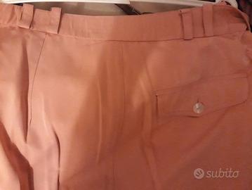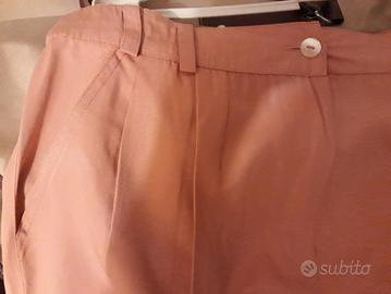 Tailleur gonna + giacca rosa salmone e blusa abbinata. La giacca ha tasche flap applicate chiuse da bottoncino. La gonna ha chiusura anteriore centrale con cerniera e bottoncino, ha lunghezza sopra il ginocchio, ha una tasca flap applicata sul dietro e 2 tasche a filetto sui fianchi. La blusa della Rver Cafè ha scollo a barca e 3 bottoni. Il tailleur porta ancora l'etichetta della lavanderia e deve solo essere stirato. Tutto in perfette condizioni. Taglia 46.