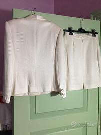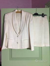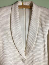 Tg. 42 tessuto nido d'ape lucido in rilievo. Revers giacca taglio smoking a due bottoni e gonna a tubino.