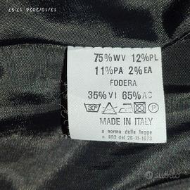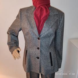 Vendo tailleur in tessuto misto lana, made in Italy, colore grigio, marca L’E - L’Equipe Plus, indossato pochissime volte, come nuovo. La giacca, foderata in viscosa e acetato, ha la chiusura a 3 bottoni neri che riprendono il bordo in ecopelle delle tasche a taglio ancora cucite, ha due piccoli passanti per poterla indossare anche con cintura; il pantalone wide leg con risvolto finale cucito, senza tasche con chiusura a zip e bottone. Ottime rifiniture. Misure in cm Giacca: lunghezza 65, spalle 42, manica 60; Pantalone: lunghezza 110, larghezza 26, cavallo 78, girovita 74, taglia italiana 44.