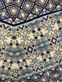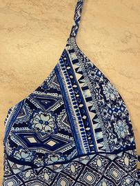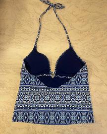 Tankini top con fantasia boho/etnica nei toni del blu, azzurro e bianco. Le coppette sono estraibili. La parte inferiore scende morbida sul busto. In ottime condizioni.