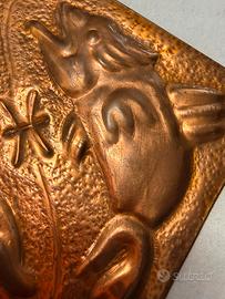 Targa in rame con pesci a rilievo simbolo d’armonia e prosperità. Misure: cm.8x8