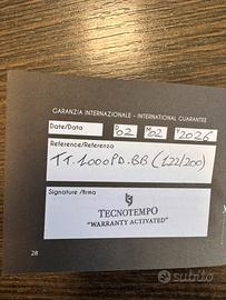 Tecnotempo Automatic Diver's 1000M Edizione Limitata 200 pezzi Il case misura 46 mm di diametro (esclusa la corona) e 16,5 mm di spessore. L'orologio Tecnotempo è stato realizzato utilizzando componenti di prima scelta. - Cassa in acciaio inossidabile 316L con trattamento PVD nero. - Movimento automatico affidabile Japan Seiko nh35 (24 rubini, riserva di carica di 41 ore con carica massima) - lunetta unidirezionale - quadrante nero - Valvola di rilascio automatico dell'elio- - Sapphire Crystal - Cinturino in gomma nera - Corona a vite - Diametro della cassa: 46mm (escludendo la corona) - Spessore della cassa: 16,5 mm - Resistente all'acqua: 1000 metri (100 ATM) - Peso: circa 165gr.
