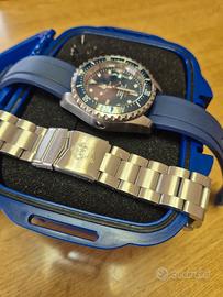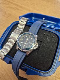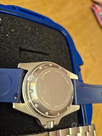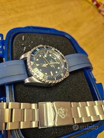 Vendo robusto e professionale Tecnotempo Diver, certificato per immersioni fino a 2000 metri (6600 FT). Un orologio tecnico con valvola per l’elio automatica ad ore 9, ideale per gli amanti degli sport acquatici e dei "tool watch". Specifiche tecniche: Movimento: Automatico (affidabile calibro giapponese Seiko NH35). Cassa: Acciaio inossidabile 316L, diametro circa 45mm. Vetro: Zaffiro antigraffio. Resistenza: Impermeabile fino a 2000 metri con corona a vite. Ghiera: Girevole unidirezionale in ceramica/acciaio. Corredo e Accessori: L'orologio è fornito come mostrato in foto: Custodia originale tecnica (box blu antiurto). Doppio cinturino: Cinturino in gomma blu montato + bracciale originale in acciaio mai usato. Condizioni e Consegna: Orologio in condizioni pari al nuovo. NON EFFETTUO SPEDIZIONE. Esclusivamente consegna a mano in provincia di Monza e Brianza. Visione di persona per confermare la qualità costruttiva e lo stato impeccabile dell'oggetto. Prezzo poco trattabile.