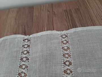 Vendo un telo di lino a trama larga (la cosiddetta garza) trasformabile in tenda. Nuovo, con sfilature verticali a giorno e ricamo a intaglio. Color panna. Perfetto.
