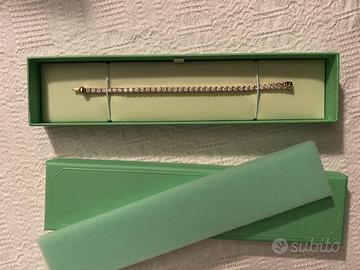 Bracciale Swarovski modello Tennis Deluxe. II gioiello è caratterizzato da una fila di pietre bianche circolari molto luminose, con una raffinata placcatura in tonalità oro rosa. Pari al nuovo, indossato solo una volta per un evento.