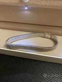 Vendo per inutilizzo bracciale Tennis a quattro stradi di Diamanti taglio Brillante. Bracciale in Oro 18 KT grammi 25 Caratteristiche qualitative delle pietre Descrizione: Diamanti naturali Forma: Rotonda Taglio: Brillante 57 faccette Peso: 408/Ct 8 (circa) Grado purezza: 10xVs Grado colore: Top Wesselton (G)