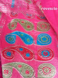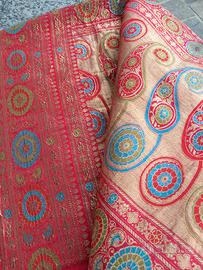 prezioso sari indiano rosso tessuto in seta lavorato con fili oro colori verdi turchese operato a contrasto fucsia, meravigliosi bordi oro misure 515x115, originale