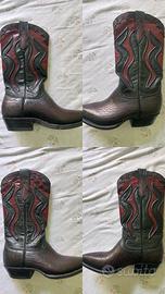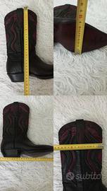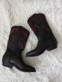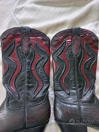 stivali texani originali vintage brand Cuadra made in Messico. In vera pelle di alligatore molto pregiati. Taglia 22 Messicana sarebbe un 35, trovate le misure in foto. Neri con sfumature e fiamme bordeaux. Se avete bisogno di altre informazioni o foto basta chiedere.