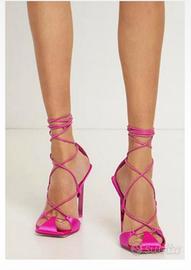 Sandali LACE-UP "ADELE" di THE ATTICO in raso e pelle. Allacciatura alla caviglia con lacci in pelle. Tacco in galvanica fuchsia. Suola esterna in cuoio. Tomaia interna in pelle.