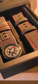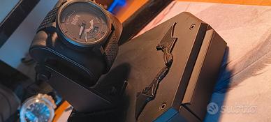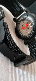 orologio automatico per l uscita del film the Batman. specifiche: The Batman x Fossil (Set Automatico LE1142SET) Questo modello è stato lanciato in occasione dell'uscita del filmThe Batman(2022) con Robert Pattinson. È un pezzo da collezione con un design tattico e scuro. Movimento:Automatico (Seiko NH35A) con riserva di carica di circa 41 ore. Cassa:43 mm o 42 mm (a seconda della specifica di mercato), in acciaio inossidabile con placcatura ionica nera opaca. Quadrante:Nero testurizzato con logo Batman, lancette con accenti rossi e datario a ore 6:00. Vetro:Fondello a vista con logo del pipistrello rosso stampato sul vetro. Impermeabilità:10 ATM. Cinturini:Include tre cinturini intercambiabili in materiali tecnici (Kevlar, nylon balistico e silicone stampato). più cinturino in acciaio 316 nero milanese.