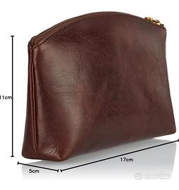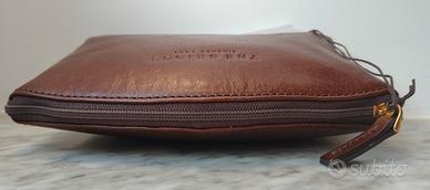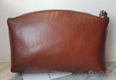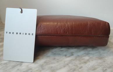 Originale e nuova borsetta a mano, pochette, beauty case unisex in vera pelle colore cuoio. Marca The Bridge, Nuovo con etichetta.