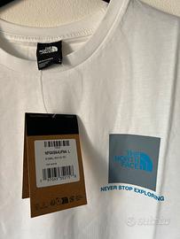 T-shirt The North Face originale, nuova con cartellino. Taglia L. Colore: bianco. Materiale: 100% cotone – tessuto morbido e leggero. ✅ Logo The North Face sul petto ✅ Frase “Never Stop Exploring” ✅ Condizioni perfette, mai indossata Misure: •Spalle: 48 cm •Lunghezza: 76 cm Spedizione veloce. Perfetta sia per uso quotidiano che per look casual.