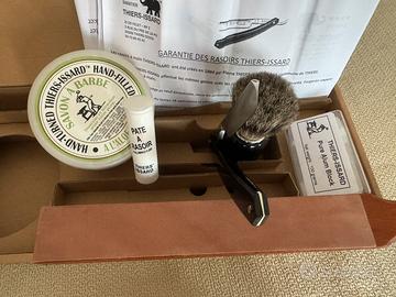 Splendido kit con rasoio a mano libera Thiers Issard da 5/8 in acciaio al carbonio C135, satinato e hollow groud.