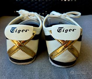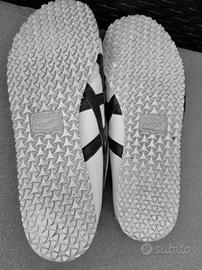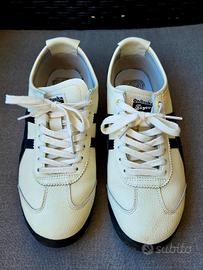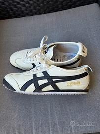 Tiger Onitsuka Mexico 66 in bianco panna e strisce nere, numero 42.5 Le scarpe sono in ottime condizioni, usate pochissimo praticamente come nuove, senza difetti vedi anche le suole in foto, con pelle trattata in stile vintage che conferisce un look unico. Modello iconico, comodissimo, perfetto per chi cerca stile particolare e qualità.