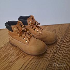 Vendo scarponcini Timberland originali, colore classico giallo miele. Modello iconico con collo imbottito nero, lacci originali e occhielli in metallo dorato.