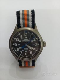 Orologio da polso quartz con quadrante che si illumina al buio, piccoli segni di usura sul vetro, cinturino nuovo