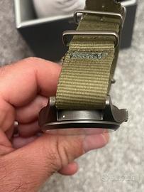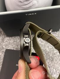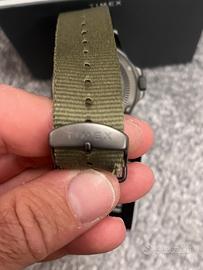 rologio ad energia solare, cassa in acciaio satinato, vetro zaffiro perfetto, corona e fondello a vite, 10 bar. Field watch davvero completo e robusto. Piccoli segni su cassa come in foto ma poco visibili una volta indossato. Vendo perché sul mio polso mi è grande, cedo con scatola e nato originale Timex