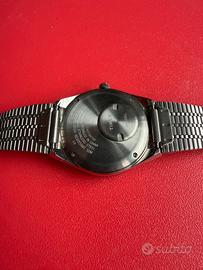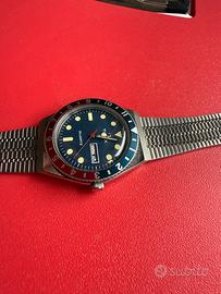 Timex Q Quartz con design retrò ispirato ai classici diver-style degli anni ’70/’80. Orologio in ottime condizioni, con: • Cassa in acciaio inox • Quadrante blu scuro con indici applicati luminosi (lume giallo/crema) • Lancette dorate con freccia rossa per i secondi • Lunetta girevole bidirezionale bicolore blu e rosso (stile “Pepsi”) • Movimento Quartz preciso e affidabile • Bracciale originale in acciaio a maglia flessibile (expansion band), comodo e regolabile L’orologio è funzionante e pronto all’uso. Il bracciale è in buono stato senza difetti evidenti, il vetro è chiaro e il quadrante pulito. Ideale per chi cerca un orologio casual/daily wear con un look sportivo e vintage al tempo stesso, perfetto per ogni occasione. • Diametro cassa: circa 37-38 mm (misurabile sul polso) • Spessore: sottile e confortevole • Resistenza all’acqua: non testata (tipica di questo modello intorno ai 30-50 m, ma da verificare)
