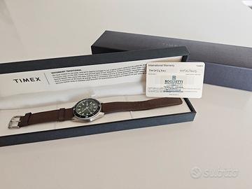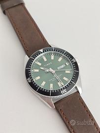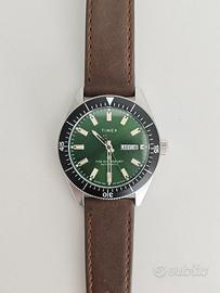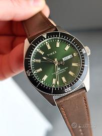 Vendo splendido Timex Waterbury Automatic con quadrante verde foresta e cinturino in pelle marrone originale. L'orologio fa parte della collezione Waterbury, che celebra l'eredità storica di Timex con finiture di ottima qualità e un design senza tempo. L'orologio è stato usato pochissimo ed è in condizioni pari al nuovo, senza segni evidenti su cassa o vetro. Caratteristiche principali: Movimento: Meccanico a carica automatica (preciso e affidabile). Cassa: Acciaio inossidabile da 40mm. Quadrante: Verde spazzolato con indici applicati e datario (Giorno/Data). Cinturino: Pelle marrone a sgancio rapido (originale Timex). Resistenza acqua: 100 metri (10 ATM). Corredo: Full Set (scatola originale, controscatola e documenti). L'orologio presenta il disco della data in doppia lingua (Inglese/Spagnolo). Perfetto sia come regalo che per arricchire la propria collezione con un pezzo versatile e di carattere. Prezzo: 150€ Spedizione: Disponibile tramite TuttoSubito o consegna a mano in zona Mirano (VE). Massima serietà.
