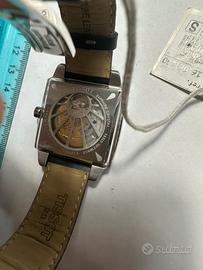 Elegante orologio Tissot automatico con cassa quadrata in acciaio e cinturino in pelle nera. Quadrante moderno con datario e fondello a vista che mostra il movimento automatico, perfetto per chi ama orologi raffinati e di qualità Swiss Made.