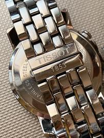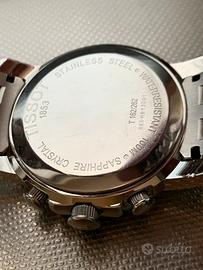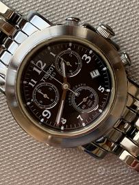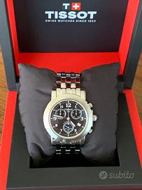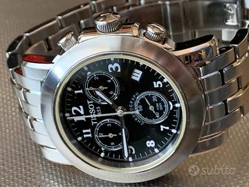 Rarissimo e pregiato cronografo vintage (anno 2005) TISSOT Chronograph W.R.100M con movimento al quarzo Swiss Made - condizioni eccellenti - funzionamento perfetto - sottoposto a revisione totale nel mese di aprile 2026 con sostituzione della piastra del circuito stampato (costo 150=Euro) - dotato del cofanetto originale (come visibile in foto) - cassa di 41mm di diametro (esclusa la corona) - quadrante nero con piccoli contatori cronografici tono su tono - corona con logo - cristallo di zaffiro - pregiato bracciale inox originale con chiusura a doppia farfalla a scomparsa con scritta TISSOT - adatto a polsi di misura massima di 18/19 cm
