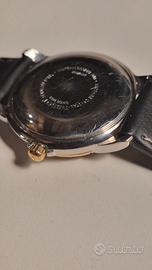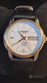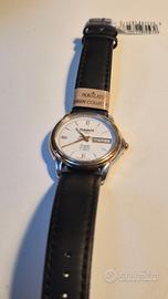 TISSOT Seastar – Automatico Modello: A660/760K Meccanismo: ETA a carica automatica. Quadrante: acciaio inossidabile, cromato, con anello placcato oro. Spessore del quadrante: circa 09,5 mm. Larghezza senza corona: 40 mm, rotondo. Larghezza del cinturino (alle anse): 18 mm. Cinturino: pelle nera. Vetro: zaffiro. Quadrante: bianco con datario a ore 3. Indici applicati. Impermeabilità: 30 m, Condizioni: molto buone – orologio ben tenuto. Vetro in perfette condizioni. Cinturino di pelle nuovo non originale.