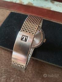 Iconico orologio meccanico vintage uomo in acciaio con bracciale mesh acciaio integrato con chiusura deployant con logo, corona originale con logo, carica manuale, quadrante argentè con indici applicati, indicazione della data a ore 3, diametro 37 mm, plexi bombato originale perfetto e senza segni.