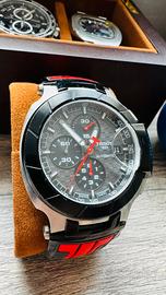 Cronografo automatico, datario, fondello a vista con rotore stile “ruota”, lunetta tachimetro, dettagli rosso/nero. Orologio sportivo iconico MotoGP.