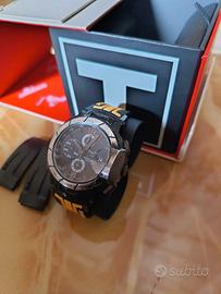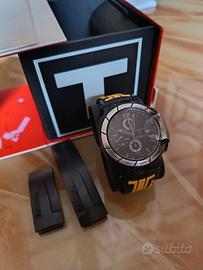 Cronografo automatico Tissot T-Race cal. ETA C01.211 Perfettamente funzionante: -crono funzionante parte, stoppa e azzera perfettamente -secondine funzionanti -vetro zaffiro antigraffio -cassa in PVD da sottolineare che il rivestimento nero sulla ghiera se ne è tolto con il tempo VEDI BENE FOTO(vendo così come lo vedete)! -ottima tenuta del tempo -cassa da 45mm -per polsi fino a 18cm - L'orologio viene spedito con il cinturino in gomma giallo/nero e in più a parte quello originale nero!!! -con box originale Il prezzo di listino è sui 1.100 euro, Le foto sono parti integranti