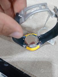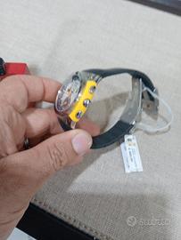 Cronografo dal design che si ispira alle linee aerodinamiche delle auto da corsa. La cassa, in acciaio lucido e satinato, ricorda l’alettone di protezione montato sulle vetture da competizione. Il cinturino è in caucciù nero con chiusura a pulsanti. Sul quadrante bianco, 3 contatori, indici e sfere a bastone luminescenti, lancetta dei secondi cronografici al centro e datario a ore 4. Scala tachimetrica