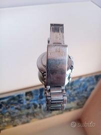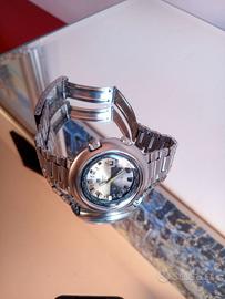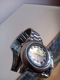 Tissot supercompressor automatico T12 Questo è un orologio Tissot dei primi anni '70 molto funky in stile disco volante. Alloggiato in una cassa a compressore in acciaio da 44 mm, l'orologio è dotato di due corone: una corona carica il movimento e imposta l'ora e l'altra regola la lunetta interna con una sorprendente lancetta dei secondi gialla.e Il quadrante ha l’’apertura della data. Questo è un orologio interessante e molto bello, perfetto per i fan della fantascienza degli anni '70! L'orologio è dotato del suo braccialetto Tissot originale con la stampigliatura “4 70". automatic T12 Tempo del mondo / gmt, World Time Orologio da polso in acciaio da uomo con bracciale in acciaio, anno 1974 (data del cinturino), quadrante 24 ore bicolore di colore bianco ore diurne grigio ore notturne, funzione lunetta girevole dell'ora mondiale: ora, minuti, secondi centrali, data, movimento Cal. 788, meccanico automatico, diametro 44 mm, altezza 13,8 mm, vetro plastica, acciaio inox, cinturino Acciaio inossidabile (22/18 mm); fibbia deplorante (2/71). Il movimento automatico è stato completamente controllato e regolato dal mio orologiaio