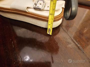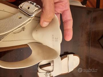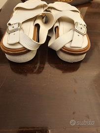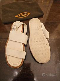 Sandali con plateau in pelle Tod’s n. 38 color panna, bordino color cuoio e fibbie argentate. Soletta interna in morbida pelle. Altezza plateau: 4 cm. Usati ma ancora in ottimo stato. 100% originali, acquistati a Roma nella boutique di via Condotti. Inclusa dustbag